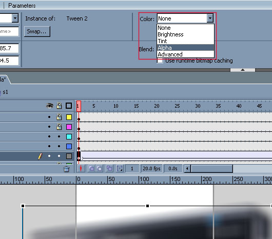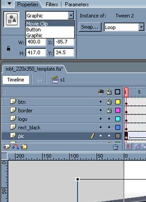 Переходим на первый фрейм этого MotionTween-а. Дальше нам нужно будет не только задать прозрачность, но и применить фильтр. Фильтры применяются только к MC, а процедура "умоушнтвинивания" сделала нам из "Навигатора" - graphics. Исправляем положение: