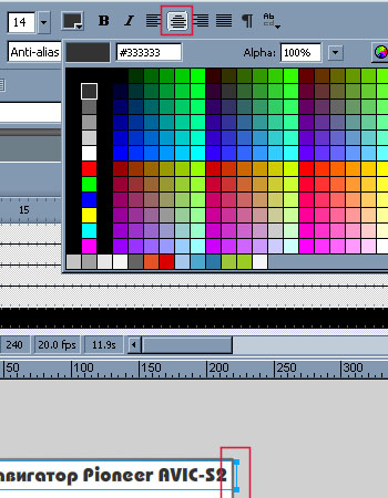 После этого сначала (!) переходим на первый фрейм этого MotionTween (у меня - 55-й фрейм MC) и ставим блик чуть ниже (или выше, если хотим, чтобы блик сначала двигался сверху вниз) надписи. Потом переходим на последнй фрейм MotionTween и создаем там кейфрейм (F6). Только после этого переходим на "серединку", там тоже - кейфрейм (F6) и двигаем наш "блик" так, чтобы он оказался на противоположной стороне. "протаскиваем" мышкой курсор на таймлайне, чтобы убедиться, что блик двигается, как надо.