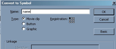 Цвет я выбрал не совсем черный - на жирных шрифтах разница в цвете не очень заметна, но "бьет по глазам" меньше и края рендерятся флэш-плагинами аккуратнее. Далее разобъем текст на отдельные символы и сразу же превратим в Shape (дважды нажимемCtrl+B), а Shape - в MC (F8) и задаем имя символа - name.
