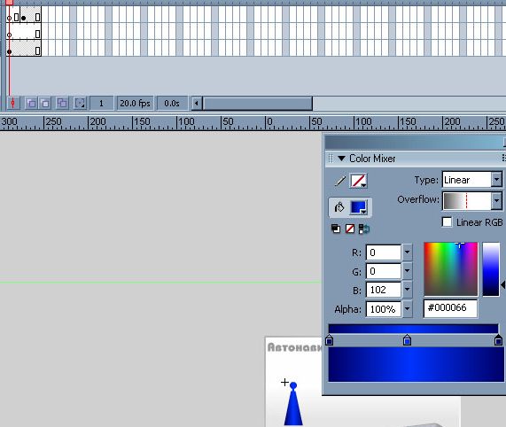 после этого где-то после 50-го фрейма (у меня - 55-й) делаем новый кейфрейм на Layer 2 и рисуем в нем прямоугольник. Прямоугольнику придаем "бликовый" градиент и правильно его (градиент) разворачиваем и масштабируем: