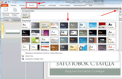 Шаг 4. Быть в теме! Чтобы придать презентации PowerPoint желаемый внешний вид, по вкладке «Дизайн» надо перейти в группу «Темы» и щёлкнуть по нужной теме документа. Чтобы изменить внешний вид слайдов, на вкладке «Слайды» выберите нужные слайды, щёлкните правой кнопкой мыши по теме, которую нужно применить к этим слайдам, и в контекстном меню выберите команду «Применить к выделенным слайдам».