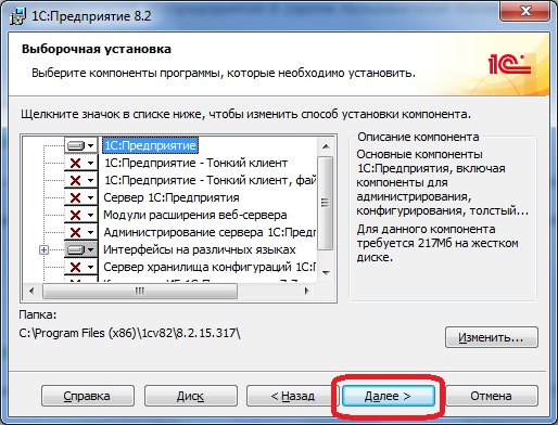 Здесь мы можем выбрать компоненты платформы и папку для установки. Состав компонентов изменять не нужно, рекомендуется устанавливать 1С в папку по умолчанию. Нажимаем "Далее":