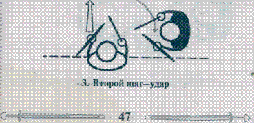 Отступление спиной, по прямой от противника — самое естественное движение человека. Однако в нашем случае это прямая дорожка к поражению. Посудите сами, в каком положении находится атакующий противник, набравший скорость в прямолинейном движении, и в каком вы—боец, едва начавший отступление и старающийся не словить удар, второй, третий и т. д. Согласитесь, слишком мало шансов оторваться от нападающего, который стартовал чуть раньше. Ухудшает положение и то, что вы двигаетесь спиной вперед, а он естественным образом. Еще хуже то, что в трех шагах позади поджидает ограждение ристалища, способное огорчить не меньше, чем удар меча. Иная картина получается, когда вы сдвигаетесь в сторону, а противник вынужден тормозить и корректировать свою атаку. Вы же в это время уже сдвигаетесь дальше и развиваете контратаку. Выводы несложны: Движение назад может быть только в свободном маневрировании, когда необходимо «вытянуть» противника на атаку, ввести его в заблуждение либо увеличить дистанцию для подготовки своей атаки. Во время атаки противника движение может быть только вперед или по дуге: вокруг соперника — вправо или влево. В некоторых случаях, когда противник атакует с близкой дистанции, можно сделать первый шаг назад -в сторону с последующим вектором движения вбок. Если вы атаковали (входили в клинч) по часовой стрелке, то выходите из атаки против часовой. Если вы оборонялись против часовой стрелки, то контратакуйте по часовой. В связи с этим напомним о целесообразности начинать тренировку с упражнения «краб» (скоростное перемещение боком, приставным шагом, с резкой сменой направления). Это упражнение может заменять разогревочный бег. Обычно закрепление ударной техники в движении пытаются организовать по формулам: шаг+удар = отшаг+удар; шаг+защита+удар = от-шаг+защита+удар и т. д. Зареченская школа использует более эффективный метод, позволяющий быстро освоить перемещения, причем в условиях максимально соответствующих реальным. Навыки перемещения приобретаются в процессе работы с «балдой». При этом любой организм сам формирует оптимальный образ движения. Нарабатываемая двигательная база получается гармоничной и целесообразной для каждого отдельного телосложения и конституции. Приобретаемый навык является не линейным, а свободным, когда боец одинаково легко перемещается в любых направлениях. Немаловажно и то, что у бойца уже с самого начала начинает вырабатываться чувство дистанции — одна из важнейших составляющих фехтования.