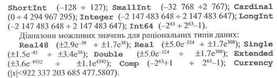 У програмі оперують зі змінними та константами, для яких попередньо визначають тип даних, щоб повідомити компілятору: • назву (ідентифікатор) змінної чи константи; • розмір і спосіб виділення пам'яті для зберігання значень; • допустимі дії, які можна виконувати зі змінною чи константою. Типи ділять на стандартні (вбудовані) і типи, визначені програмістом. Стандартні типи ділять на прості типи, рядки символів, структури, покажчики (або вказівники) та процедурні типи. Прості типи даних ділять на порядкові, раціональні і типи дати-часу. У свою чергу порядкові типи даних ділять на цілі, символьні, логічні, перелічені та обмежені. До структур відносять множини, масиви, записи, файли, класи та інтерфейси. Програміст може визначити власний тип безпосередньо при описі змінної у розділі var, або, найчастіше, у спеціальному розділі опису типів - type. Після ключового слова type для кожного типу слідує конструкція, яка має вигляд: