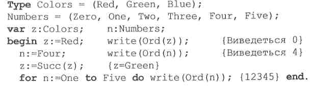 Раціональні числа зберігаються наближено, отож під чає відніманя близьких чисел можлива втрата значущості. Це ж пояснює, чому потрібно уникати порівняння раціональних величин на точну рівність. Вважають, що раціональні числа а і b є рівними, якщо виконується умова abs (a-b) < eps, де eps - мале додатне число. Раціональні типи є впорядкованими, але не порядковими. Тип відносять до впорядкованих, якщо для змінних і виразів цього типу визначені операції відношення (=, <, >, <=, >=). Будь-який порядковий тип є впорядкованим, але ніколи навпаки. Кожному значенню порядкового типу функція Orel (х) підбирає відповідне натуральне число - порядковий номер значення виразу х у множині значень цього типу. Для цілих типів повертається саме значення, для логічного 0 або 1, для символьного - значення від 0 до 255. До будь-яких порядкових типів також можна застосовувати функцію Pred(x), яка повергає попереднє значення, і Succ (x) - наступне значення. Змінні логічного типу Boolean займають у пам'яті один байт і можуть набувати одне з двох значень False (хибне) або True (істинне). Результат будь-яких операцій відношення має логічний тип і може бути привласнений логічній змінній. Змінні символьного типу Char дають змогу працювати з окремими символами. На відміну від самого тексту програми символи, які відповідають малим і великим буквам, розрізняються. Функція Ord видає код відповідного символу (від 0 до 255). Оберненою функцією, яка за кодом видає відповідний символ, є функція Chr. Перелічений тип (є порядковим; нумерація з нуля) задається множиною ідентифікаторів у круглих дужках через кому. Приклад 5.1.1. Використання перелічених типів: