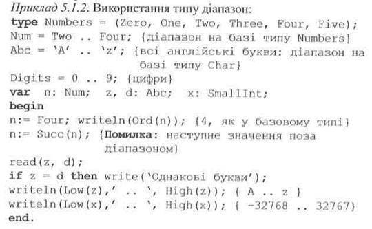 Тип діапазон також називають обмеженххм або інтервальнгш типом. Він є підмножиною свого базового типу, яким може виступати будь-який порядковий тип. Тип діапазон задається межами своїх значень у базовому типі (через двокрапку) і успадковує всі властивості цього базового типу. Є дві стандартні функції, які працюють з типом діапазону: High (x) - повертає максимальне значення діапазону, до якого належить змінна х; Low (х) - повертає мінімальне значення.