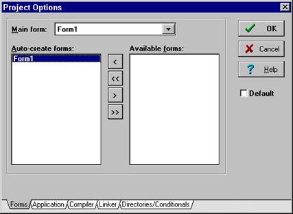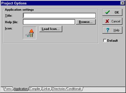 На странице Forms можно выбрать главную форму проекта. Изменения, которые Вы сделаете, отобразятся в соответствующем файле DPR. Например, в нижеследующем проекте, Form1 является главной, поскольку появляется первой в главном блоке программы: program Project1; uses Forms, Unit1 in 'UNIT1.PAS' {Form1}, Unit2 in 'UNIT2.PAS' {Form2}; {$R *.RES} begin Application.CreateForm(TForm1, Form1); Application.CreateForm(TForm2, Form2); Application.Run; end. Если изменить код так, чтобы он читался begin Application.CreateForm(TForm2, Form2); Application.CreateForm(TForm1, Form1); Application.Run; end. то теперь Form2 станет главной формой проекта. Вы также можете использовать эту страницу для определения, будет ли данная форма создаваться автоматически при старте программы. Если форма создается не автоматически, а по ходу выполнения программы, то для этого нужно использовать процедуру Create. Кстати, в секции Uses имя формы в фигурных скобках является существенным для Менеджера Проектов и удалять его не стоит. Не нужно вообще ничего изменять вручную в файле проекта, если только Вы не захотели создать DLL, но об этом позднее. 5. На странице Applications, см. рис.5, вы можете задать заголовок (Title), файл помощи (Help file) и пиктограмму (Icon) для проекта.