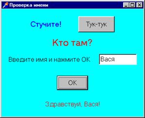 Компьютер должен запросить имя пользователя (пароль). Если пользователь дает правильный ответ (вводит знакомое имя, например, Вася), то компьютер приветствует его (рис.1). В случае ввода любого другого слова, компьютер должен реагировать иначе, например, выводить запрос: "А где Вася?" Рис.1 Рекомендуемый план разработки программы 1. Откройте новый проект. 2.