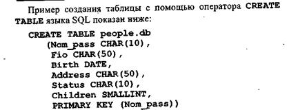 В результате выполнения данного запроса будет создана таблица people. db (формат Paradox), которая содержит шесть полей с указанными именами и типом данных. Первичный ключ строится на основе первого поля Nom_j?ass. Для удаления таблицы используется оператор DROP TABLE. Он имеет такой синтаксис: DROP TABLE Имя_>габлицы Пример удаления таблицы показан ниже: