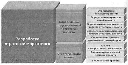 Рис. 8.2.1. Двумерный анализ структуры и емкости рынка Анализ каналов сбыта направлен на оценку существующих и/или проектирование оптимальных цепочек, связывающих проект с конечными пользователями его продукции. Традиционно исследуются 3 разновидности сбыта: » сбыт через оптовых торговцев; » сбыт через розничных торговцев; » сбыт непосредственно потребителям (прямая продажа). При анализе конкуренции внимание обращается на конкуренцию как между производителями, так и между товарами. Обычно выделяют 5 факторов, требующих детального анализа: » текущие конкуренты; » вероятность появления новых конкурентов; » вероятность появления товаров-заменителей; » способность потребителя идти на сделки; » способность поставщика идти на сделки. Более подробно анализ конкуренции описан в специализированной литературе [28, 29]. Макроэкономический анализ направлен на выявление существующих тенденций в мировой и национальной экономике в интересующих отраслях и аспектах. Цель анализа социально-экономической среды — определение социальных и социально-экономических аспектов, относящихся к подготовке и оценке стратегии проекта и концепции маркетинга. Эти аспекты могут отражать общество и его культуру, социальную и экономическую политику в регионах, а также существующие правила, традиции и обычаи. В рамках внутреннего анализа первый шаг — анализ участников проекта и их ресурсов, на котором собирается и обрабатывается информация о потенциально сильных и слабых сторонах проекта. Одним из важных в современной экономике факторов успеха являются передовые технологии. Анализ доступных технологий направлен на оценку рынка технологий, выбора технологических рядов, определения требований к применению технологии (капиталовложения, уровень знаний и умений, система управления и пр.). Анализ продукции проекта заключается в сопоставлении проектируемой продукции с уже существующей и/или «идеальной», т. е. представляемой покупателями. При этом задействуют инструменты аналитического позиционирования. Эти же инструменты, а также результаты анализа продукции используют при целевом позиционировании. К числу данных инструментов можно отнести: » построение профилей; » позиционирование, основанное на сходстве торговых марок; » многомерное позиционирование (в т. ч. динамическое); » иерархический кластерный анализ; » кластерное позиционирование (в том числе многомерное); » позиционирование по отношению к «идеальным» товарам; » позиционирование с применением сопряженного анализа; » позиционирование по рыночным сегментам; » позиционирование на основе полезных свойств. Подробное описание этих инструментов читатель может найти в специализированной литературе [27, 31]. Результаты маркетинговых исследований необходимы, прежде всего, для разработки маркетинговой стратегии проекта. 8.3. Разработка маркетинговой стратегии проекта Маркетинговой стратегией проекта называют совокупность глобальных (общезначимых для всего проекта) целевых установок (структуры целей, принципиальных методов их достижения), ориентирующих всю деятельность по маркетингу проекта в направлении достижения максимального рыночного результата. Структура деятельности по разработке маркетинговой стратегии представлена на рис. 8.3.1.