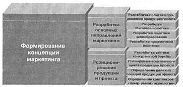 Оценку синергетического эффекта стратегических позиций проекта можно укрупненно свести к определению того положительного экономического или иного эффекта, возникающего от совмещения различных стратегических усилий или их отдельных аспектов. Методы и средства оценки синергетического эффекта подробно описаны в специализированной литературе [17, 26]. Определение целевых стратегических позиций производится на основе всего предыдущего анализа и с использованием инструментов стратегического позиционирования. После этого в рамках определения структуры целей и стратегии проекта устанавливаются целевые стратегические позиции проекта, а также исследуются наиболее важные аспекты стратегии, — обычно географический и технологический, но, в зависимости от специфики проекта, на первый план могут выходить и другие аспекты — финансовый, организационный, кадровый и пр. Определение структуры целей проекта осуществляется на базе накопленной к этому времени информации и с использованием традиционных методов структурной декомпозиции. Базовые маркетинговые стратегии обычно выбираются из числа традиционных — таких, как стратегия: » лидерства по издержкам; » дифференциации; » концентрации усилий на рыночной нише; » проникновения на рынок; » развития рынка; » диверсификации; » разработки продукта; » расширения рынка. Эти и другие, более специфические виды маркетинговых стратегий, а также процесс их выбора описаны в специализированной литературе [3—6, 9, 18, 28]. 8.4. Формирование концепции маркетинга проекта Концепция маркетинга — тактический срез всей маркетинговой деятельности, в котором определяются среднесрочные, важные (но, в отличие от стратегии, не общезначимые для всего проекта) направления, целевые ориентиры, выбранные методы реализации определенной ранее стратегии.