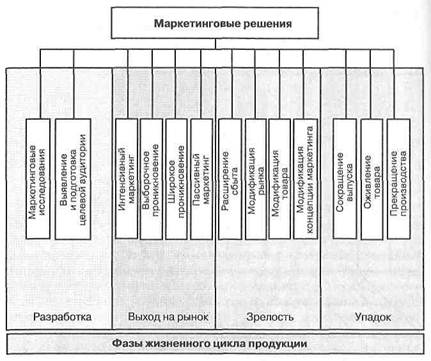 Рис. 8.4.4. Структура маркетинговых решений в зависимости от фаз жизненного цикла продукции Стадия разработки продукта является подготовительной, но именно на ней закладываются основные решения по продукту и маркетингу проекта, которые обуславливают дальнейшее развитие. На этой стадии принципиально выделяют 2 составляющие: » маркетинговые исследования; » выбор и подготовка целевой аудитории. Стадия выхода на рынок (или стадия внедрения) характеризуется медленным ростом объема продаж. При выходе на рынок с продуктом, находящимся в этой фазе жизненного цикла, можно варьировать цену, систему сбыта, расходы на стимулирование сбыта, качество товара. На 1-й фазе существует 4 варианта маркетинговых решений: » интенсивный маркетинг; » выборочное проникновение; » широкое проникновение; » пассивный маркетинг. Если продукт находится на стадии зрелости, возможно принятие следующих маркетинговых решений: » расширение сбыта; » модификация рынка; » модификация товара; » модификация концепции маркетинга. Для большинства продуктов, в конце концов, наступает время заметного уменьшения объема продаж — начинается стадия спада. В зависимости от конкретных условий, руководители проекта могут выбрать 3 варианта действий: » сократить объем выпуска и число торговых точек, где продавался продукт, » «оживить» товар путем его модификации, изменения упаковки, организации новых форм сбыта и т.п., » прекратить производство и организовать быструю распродажу по низким ценам (чтобы не загружать сбытовую сеть).