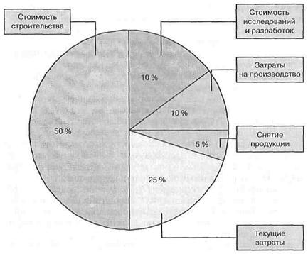 Рис. 14.1.1. Управление стоимостью на протяжении жизненного цикла проекта Представленная концепция будет описана по мере рассмотрения процессов, составляющих управление стоимостью, особенно процесса оценки стоимости проекта, так как этот процесс является основным как для бюджетирования и контроля, так и для функции управления стоимостью в целом. Распределение стоимости проекта в течение его жизненного цикла неравномерно и обычно имеет структуру, представленную на рис. 14.1.2. Как видно, основная часть стоимости возникает на фазе реализации проекта. Но следует отметить, что основные решения, обусловливающие показатели стоимости проекта, принимаются на предынвестиционной фазе проекта. Таким образом, возможность управления стоимостью проекта также распределяется неравномерно на протяжении всего его жизненного цикла. 14.2. Оценка стоимости проекта В зависимости от этапа жизненного цикла проекта и целей оценки применяют различные виды и методы оценки стоимости проекта. Исходя из целей оценок, разной бывает и точность таких оценок.