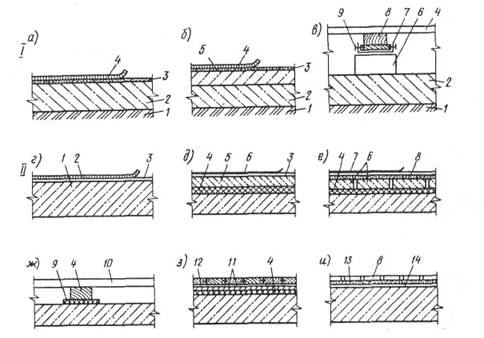 Полы (требования, виды, конструкции) Полы должны удовлетворять требованиям прочности, сопротивляемости износу, достаточной эластичности и бесшумности, удобства уборки и т.д. Стоимость пола в междуэтажных перекрытиях близка к стоимости несущей части перекрытия, но затраты труда на их устройство в 4 раза больше. Полы устраивают на грунте или по междуэтажным перекрытиям. Основные элементы полов - покрытие (чистый пол), а в полах на грунте - и подстилающий слой (подготовка). В состав полов могут входить также различные виды изоляции, прослойки и стяжки. Покрытие пола (чистый пол) - верхний слой пола, непосредственно подвергающийся износу и другим эксплуатационным воздействиям. Покрытия полов разделяют по способу устройства на полы из листовых материалов, штучные и сплошные. Стяжка - слой, служащий для выравнивания поверхности подстилающего слоя или основания, а также для придания покрытию требуемого уклона. Кроме того, стяжку применяют для устройства жесткой или плотной корки по нежесткому или пористому теплоизоляционному слою. Материалом для стяжки служат бетон, шлакобетон, гипсобетон, цементно - песчаный раствор, асфальт. Основанием для пола является перекрытие железобетонное или деревянное, или слой грунта (в полах на грунте), воспринимающие все нагрузки, действующие на пол. Тепло- и звукоизоляционные слои устраивают в полах на грунте (из легкобетонных плит, пенобетона, шлака) и по междуэтажным перекрытиям. Материалом для звукоизоляционного слоя в полах по междуэтажным перекрытиям обычно служат упругие плитные и сыпучие прокладки или легкобетонные, пенобетонные плиты. К упругим плитным звукоизоляционным материалам относятся древесноволокнистые, асбестоцементные, минераловатные плиты, к сыпучим звукоизоляционным материалом (засыпкам) — шлак, песок, керамзит и т.п. Подстилающий слой (подготовка) применяется в полах, устраиваемых на грунте, и служит для распределения нагрузки на основание. Толщина подстилающего слоя зависит от плотности поверхностных слоев грунта и принимается для известкового - щебеночного и асфальтобетонного не менее 60 мм, шлакового, гравийного, известково - щебеночного, глинобетонного - 80 мм. Сплошные полы. К этой группе относят земляные и глинобетонные полы: графитные, шлаковые и щебеночные; бетонные, цементно – песчаные и мозаичные; асфальтобетонные и дегтебетонные, поливинилацетатные и др. Грунтовые (земляные и глинобетонные) полы устраивают обычно в цехах с высокой температурой, в складских помещениях, где возможно повреждение пола при падении тяжелых изделий. Глинобетонный пол (рис. 2.29, а) делают из смеси, содержащей около 70-85 % песка и 15-30 % глины. Смесь необходимо уплотнять слоями толщиной не более 100 мм. Эти полы являются жаростойкими, полутеплыми, однако они образуют пыль. Гравийные, шлаковые и щебеночные полы. Гравийные полы выполняют из гравийно-песчаных смесей, а шлаковые из каменно-угольных шлаков.
