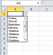 Рисунок 16.3 – Контроль введення даних За допомогою функції Проверка вводимых значений також можливо реалізувати списки підстановки. Таким чином комірка, в якій буде встановлене таке правило, матиме випадаючий список значень, що встановлюється полем Источник при обраному типу данних Список. Цей список не що інше як будь який стовпчик з робочої книги, що може міститись як на поточному, так і на будь-якому іншому листі робочої книги. Наприклад при вказаному переліку місяців, що містяться в комірках з О10 по О21, вказавши їх у якості джерела для списку, комірка матиме наступний вигляд: