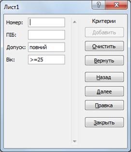 Переходять до режиму пошуку клацанням мишею на кнопці Далее. Як результат, у початковому вікні (рис. 2.105) з'являється перший із записів бази даних, що задовольняє задані критерії. Запис переглядають і в разі потреби корегують. Після клацання мишею на кнопці Закрыть Excel записує відновлений запис у базу даних. Усі подальші записи переглядають у вікні за допомогою кнопок Назад і Далее.