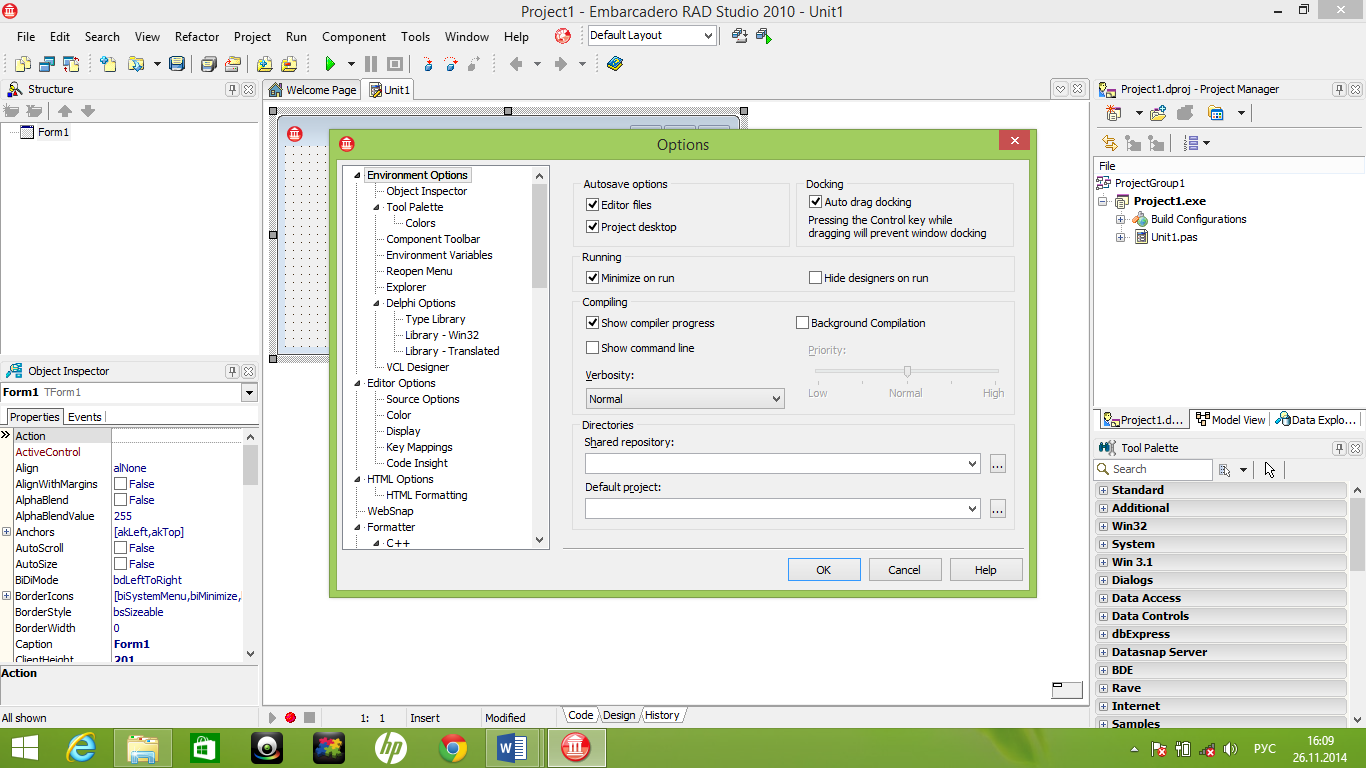 Цель: Исследовать основные настройки проекта в Delphi 2010. ТО и ПО: OC Windows 7, Delphi 2010. МО: методические указания. Описание хода выполнения работы: Запустила систему Delphi. Для изменения основных настроек я выполнила команду: меню – Инструменты –Опции, это продемонстрировано на рисунке 5.1.