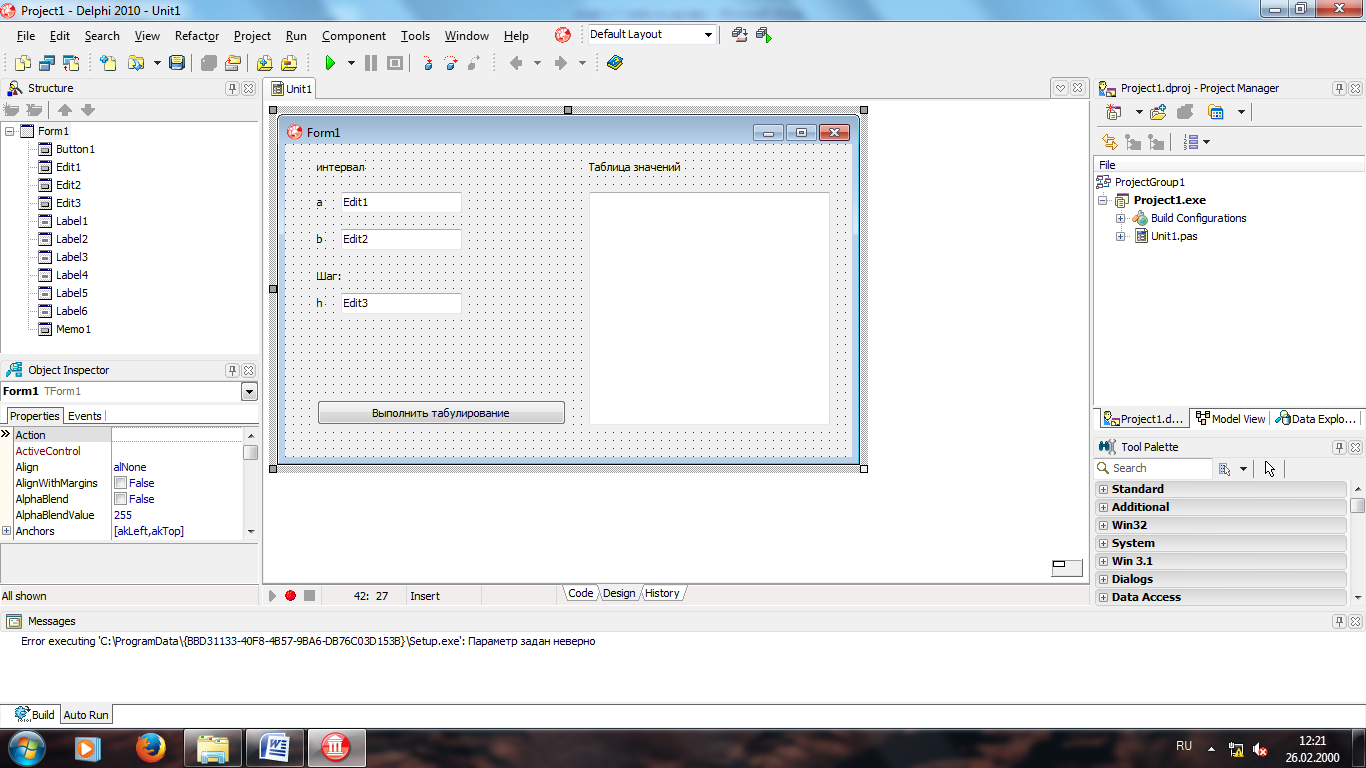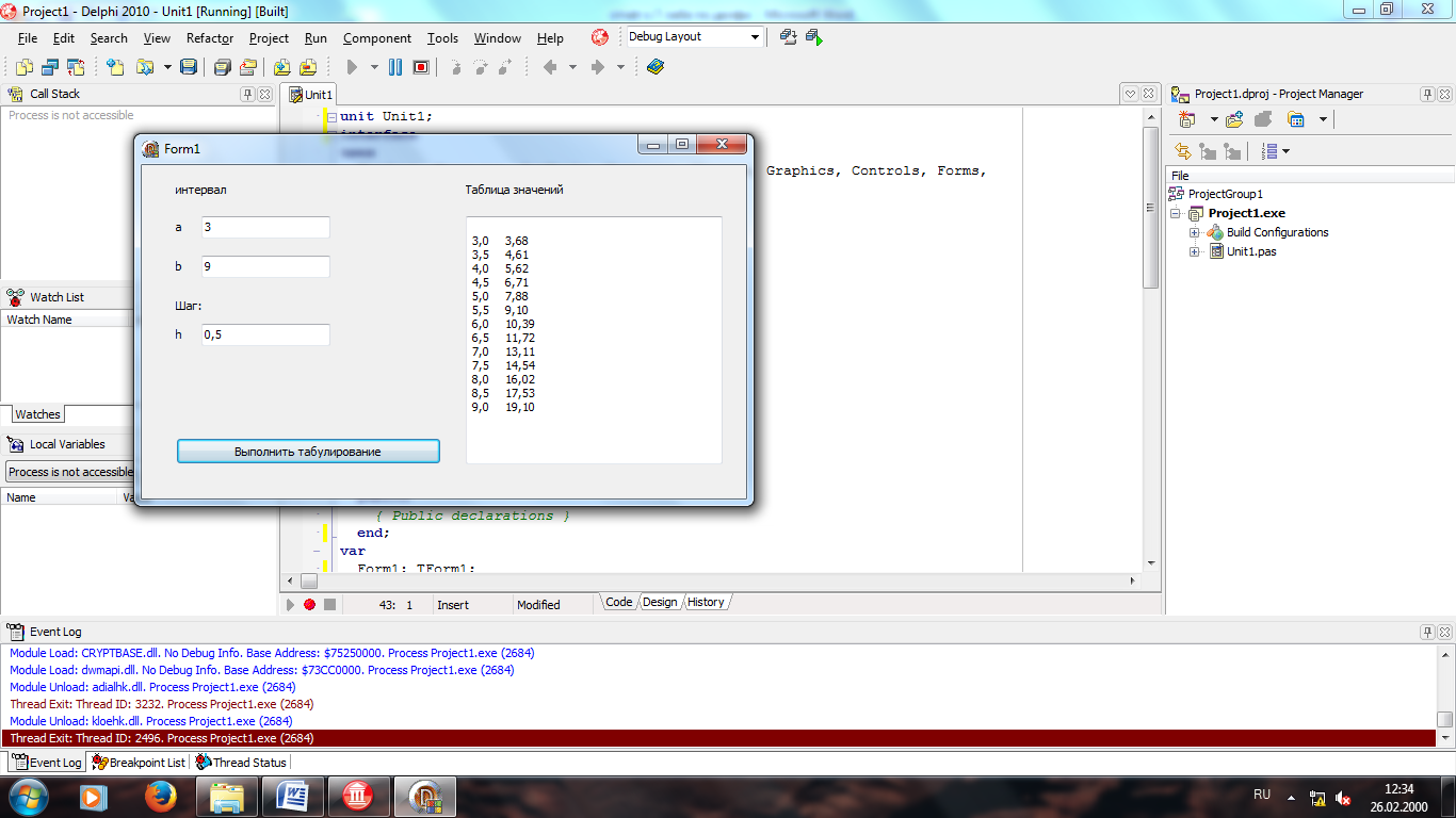 Цель: Приобретение навыка кодирования, отладки и тестирование циклических алгоритмов в среде Delphi. ТО и ПО: ОС Windows (7), Delphi 2010. МО: методические указания. Задание на лабораторное занятие: Требуется разработать программу с использованием цикла while, осуществляющую табулирование функции