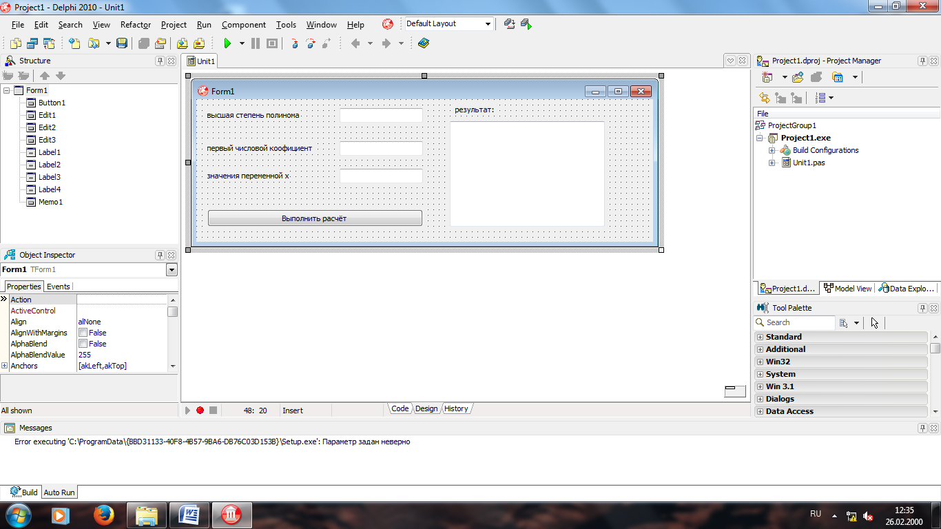 Разместила компоненты интерфейса для организации диалога с пользователем, а именно: поле ввода высшей степени полинома, поле для ввода первого коэффициента и поле для ввода значения переменной х (рис. 8.3).