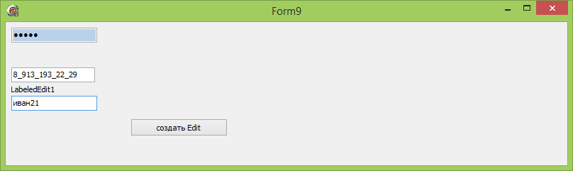 Настроила свойства для однострочного редактора Edit. Технология настройки шаблона ввода однострочного компонента. Значение CharCaseустановила в ecUpperCase; Значение Colorустановила в clGradientActiveCaption. Значения Font.Colorустановила в clNavy. Значение MaxLengthустановила равным 10. Значение PassWordCharустановила символ *. Разработала приложение, содержащее текстовое поле, которое позволяет пользователю ввести номер сотового телефона только в соответствии с шаблоном: *_***_***_**_**, где * - любая цифра. Для этого использовала компонент MaskEdit – маскированный ввод, расположенный на странице Additionalпалитры компонентов Delphi. Разработанное приложение представлено на рисунке 10.2.