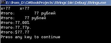Метод Format Метод Format в наших примерах встречался многократно. Всякий раз, когда выполнялся вывод результатов на консоль, неявно вызывался и метод Format. Рассмотрим оператор печати: Console.WriteLine("s1={0}, s2={1}", s1,s2); Здесь строка, задающая первый аргумент метода, помимо обычных символов содержит форматы, заключенные в фигурные скобки. В данном примере используется простейший вид формата, определяющий объект, который должен быть подставлен в то место строки, которое занято данным форматом. Помимо неявных вызовов часто возникает необходимость явного форматирования строки. Давайте рассмотрим общий синтаксис как самого метода Format, так и используемых в нем форматов. Метод Format, как и большинство методов, является перегруженным и может вызываться с разным числом параметров. Первый необязательный параметр метода задает провайдера, определяющего национальные особенности, используемые в процессе форматирования. В качестве такого параметра должен быть задан объект, реализующий интерфейс System.IFormatProvider. Если этот параметр не задан, то используется культура, заданная по умолчанию. Вот примеры двух реализаций этого метода: public static string Format(string, object); public static string Format(IFormatProvider, string, params object[]); Параметр типа string задает форматируемую строку. Эта строка содержит один или несколько форматов, распознаваемых за счет фигурных скобок, окружающих формат. Число форматов, вставленных в строку, определяет и число объектов, передаваемых при вызове метода Format. Каждый формат, определяет форматирование объекта, на который он ссылается и который, после преобразования его в строку, будет подставлен в результирующую строку вместо формата. Метод Format в качестве результата возвращает переданную ему строку, в которой все спецификации формата заменены строками, полученными в результате форматирования объектов. Общий синтаксис, специфицирующий формат, таков: {N [,M [:<коды_форматирования>]]} Обязательный параметр N задает индекс объекта, заменяющего формат. Можно считать, что методу всегда передается массив объектов, даже если фактически передан один объект. Индексация объектов начинается с нуля, как это принято в массивах. Второй параметр M, если он задан, определяет минимальную ширину поля, отводимую строке, вставляемой вместо формата. Третий необязательный параметр задает коды форматирования, указывающие, как следует форматировать объект. Например, код C (currency) говорит о том, что параметр должен форматироваться как валюта с учетом национальных особенностей представления. Код P (percent) задает форматирование в виде процентов с точностью до сотой доли. Все становится ясным, когда появляются соответствующие примеры. Вот они: public void TestFormat() { //метод Format int x=77; string s= string. Format("x={0}",x); Console.WriteLine(s + "\tx={0}",x); s= string. Format("Итого:{0,10} рублей",x); Console.WriteLine(s); s= string. Format("Итого:{0,6:######} рублей",x); Console.WriteLine(s); s= string. Format("Итого:{0:P} ",0.77); Console.WriteLine(s); s= string. Format("Итого:{0,4:C} ",77.77); Console.WriteLine(s); //Национальные особенности System.Globalization.CultureInfo ci = new System.Globalization.CultureInfo("en-US"); s= string. Format(ci,"Итого:{0,4:C} ",77.77); Console.WriteLine(s); }// TestFormat Приведу некоторые комментарии к этой процедуре. Вначале демонстрируется, что явный и неявный вызов метода Format дают один и тот же результат. В дальнейших примерах показано использование различных спецификаций формата с разным числом параметров и разными кодами форматирования. В частности показан вывод проце