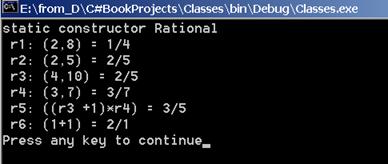 private Rational(int a, int b, string t) { m = a; n = b; } Поскольку при перегрузке методов (в данном случае конструкторов) сигнатуры должны различаться, то пришлось ввести дополнительный аргумент t для избежания конфликтов. Поскольку конструктор закрытый, то гарантируется корректное задание аргументов при его вызове. Определим теперь константы класса, которые, как я уже говорил, задаются статическими полями с атрибутом readonly: //Константы класса 0 и 1 - Zero и One public static readonly Rational Zero, One; А теперь зададим статический конструктор, в котором определяются значения констант: static Rational() { Console.WriteLine("static constructor Rational"); Zero = new Rational(0, 1, "private"); One = new Rational (1, 1, "private"); }// Статический конструктор Как это все работает? Статический конструктор вызывается автоматически один раз до начала работы с объектами класса. Он и задаст значения статических полей Zero, One, представляющих рациональные числа с заданным значением. Поскольку эти поля имеют атрибут static и readonly, то они доступны для всех объектов класса и не изменяются в ходе вычислений, являясь настоящими константами класса. Прежде чем привести пример работы с константами, давайте добавим в наш класс важные булевы операции над рациональными числами – равенство и неравенство, больше и меньше. При этом две последние операции сделаем перегруженными, позволяя сравнивать рациональные числа с числами типа double: public static bool operator ==(Rational r1, Rational r2) { return ((r1.m ==r2.m)&& (r1.n ==r2.n)); } public static bool operator!=(Rational r1, Rational r2) { return ((r1.m!=r2.m)|| (r1.n!=r2.n)); } public static bool operator <(Rational r1, Rational r2) { return (r1.m * r2.n < r2.m* r1.n); } public static bool operator >(Rational r1, Rational r2) { return (r1.m * r2.n > r2.m* r1.n); } public static bool operator <(Rational r1, double r2) { return ((double)r1.m / (double)r1.n < r2); } public static bool operator >(Rational r1, double r2) { return ((double)r1.m / (double)r1.n > r2); } Наш последний пример демонстрирует работу с константами, булевыми и арифметическими выражениями над рациональными числами: public void TestRationalConst() { Rational r1 = new Rational(2,8), r2 = new Rational(2,5); Rational r3 = new Rational(4, 10), r4 = new Rational(3,7); Rational r5 = Rational.Zero, r6 = Rational.Zero; if ((r1!= Rational.Zero) && (r2 == r3))r5 = (r3+Rational.One)*r4; r6 = Rational.One + Rational.One; r1.PrintRational("r1: (2,8)"); r2.PrintRational("r2: (2,5)"); r3.PrintRational("r3: (4,10)"); r4.PrintRational("r4: (3,7)"); r5.PrintRational("r5: ((r3 +1)*r4)"); r6.PrintRational("r6: (1+1)"); } Результаты работы этого примера показаны на рис. 16.6.