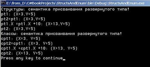 Рис. 17.1. Операции над точками и размерами Обратите внимание, метод ToString, определенный для этих структур, выдает строку со значениями полей в приемлемой для восприятия форме. Еще раз о двух семантиках присваивания В заключение разговора о ссылочных и развернутых типах построим класс CPoint, являющийся полным аналогом структуры Point. Не буду приводить описание этого класса, надеюсь, оно достаточно понятно. Ограничусь примером, в котором аналогичные действия выполняются над объектами, принадлежащими структуре Point и классу CPoint: public void TestTwoSemantics() { Console.WriteLine("Структуры: присваивание развернутого типа!"); Point pt1 = new Point(3,5), pt2; pt2 = pt1; Console.WriteLine ("pt1: " + pt1); Console.WriteLine ("pt2=pt1: " + pt2); pt1.X +=10; Console.WriteLine ("pt1.X =pt1.X +10: " + pt1); Console.WriteLine ("pt2: " + pt2);