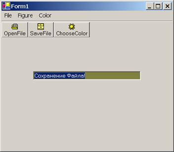 <Рис. 24.11. Проектирование панели с командными кнопками> Проанализируем теперь созданный дизайнером программный код. Как всегда начнем с полей класса, хранящих созданные в процессе проектирования элементы: private System.Windows.Forms.ToolBar toolBar1; private System.Windows.Forms.ImageList imageList1; private System.Windows.Forms.ToolBarButton toolBarButton1; private System.Windows.Forms.ToolBarButton toolBarButton2; private System.Windows.Forms.ToolBarButton toolBarButton3; В методе InitializeComponent эти объекты создаются и инициализируются: this. toolBar1 = new System.Windows.Forms.ToolBar(); this. imageList1 = new System.Windows.Forms.ImageList(this. components); this. toolBarButton1 = new System.Windows.Forms.ToolBarButton(); this. toolBarButton2 = new System.Windows.Forms.ToolBarButton(); this. toolBarButton3 = new System.Windows.Forms.ToolBarButton(); … // toolBar1 this. toolBar1.Buttons.AddRange(new System.Windows.Forms.ToolBarButton[] { this. toolBarButton1, this. toolBarButton2, this. toolBarButton3}); this. toolBar1.DropDownArrows = true; this. toolBar1.ImageList = this. imageList1; this. toolBar1.Name = "toolBar1"; this. toolBar1.ShowToolTips = true; this. toolBar1.Size = new System.Drawing.Size(432, 42); this. toolBar1.TabIndex = 1; this. toolBar1.ButtonClick += new System.Windows.Forms.ToolBarButtonClickEventHandler(this. toolBar1_ButtonClick); // toolBarButton1 this. toolBarButton1.ImageIndex = 0; this. toolBarButton1.Text = "OpenFile"; this.toolBarButton1.ToolTipText = "Диалоговое окно открытия файла "; … Этот текст должен быть понятен без комментариев, а вот об обработчике события Click стоит сказать несколько слов. Во-первых, событие Click не связывается с каждой командной кнопкой, расположенной на панели, – оно связано с самой панелью. Так что в обработчике происходит разбор случаев с анализом того, какая кнопка была нажата. Вот как это делается: private void toolBar1_ButtonClick(object sender, System.Windows.Forms.ToolBarButtonClickEventArgs e) { int buttonNumber = toolBar1.Buttons.IndexOf(e.Button); switch (buttonNumber) { case 0: OpenFileDialog openFileDialog1 = new OpenFileDialog(); openFileDialog1.ShowDialog(); //код, показывающий, что делать с открытым файлом textBox1.Text = "Открытие Файла!"; break; case 1: SaveFileDialog saveFileDialog1 = new SaveFileDialog(); saveFileDialog1.ShowDialog(); //код, анализирующий результат операции сохранения файла textBox1.Text = "Сохранение Файла!"; break; default: ColorDialog colorDialog1 = new ColorDialog(); if (colorDialog1.ShowDialog()== DialogResult.OK) this. textBox1.BackColor =colorDialog1.Color; break; } } В заключение взгляните на спроектированную форму с меню и панелью с командными кнопками: