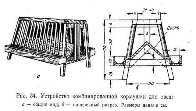 Решетчатые щиты состоят из брусков и прибитых к ним гладко оструганных досок толщиной 15—20 мм (для клеток и секций в бараннике — толщиной 25 мм). Размеры щитов: длина — 1; 1,5; 2; 3 и 4 м, высота для клеток в родильном отделении — 50—60 см, для клеток-кучек и оцарков —1— 1,2 м, просветы между досками — 8—10 см, высота щитов для клеток в бараннике, а также ограждений (переносных перегородок) секций во всех зданиях — 1,2—1,5 м с просветами 12—15 см. В ограждениях для клеток должны быть дверки шириной 60—80 см. При зимнем ягнении на 800 маток требуется 120 щитов длиной 1—1,5 м для устройства клеток- кучек, 14—16 двухметровых щитов для устройства клеток в родильном отделениях, 120 щитов длиной 3—4 м для устройства оцарков внутри овчарни и на базу. Для раздачи овцам грубых кормов в помещениях и на базах используют ясли и для дачи концентрированных кормов — рештаки. Последние делают из строганных досок в виде корыта или в форме желоба (нижние края досок соединяются под углом). Ширина рештака 25—30 см и глубина 10—12 см. Укрепляют их на стойках («козлах») на высоте 30—40 см от пола. Количество рештаков нужно иметь такое, чтобы по фронту их на одну голову животного приходилось 25 см. Наиболее пригодны комбинированные двухсторонние кормушки (рис. 34).