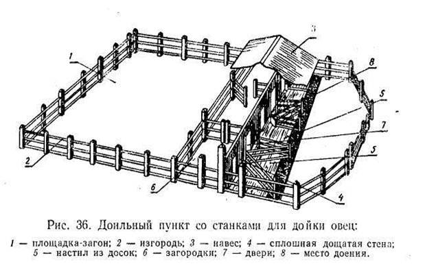 Овечье молоко отличается большей питательностью, оно богато белком (5,2%) и жиром (6,6%). Из овечьего молока готовят брынзу, местные сыры и ценные товарные сорта сыров, а также кислое молоко, творог и сливки. Смушковых и каракульских овец доят не больше 60— 90 дней. Доение начинают сразу после убоя ягнят и прекращают за 1—lV месяца до случки. При правильной организации двукратного доения в течение суток и соблюдении зоогигиенических и санитарных требований от каждой овцы можно получить 60—100 кг молока. Доят также здоровых овец грубошерстных пород. Не доят овец тонкорунных пород, романовских, а также овец, ягнята которых плохо упитаны или недоразвиты. Кроме того, доение запрещают в неблагополучных по бруцеллезу хозяйствах. Подсосных овец начинают доить один раз в сутки рано утром с того времени, когда их ягнята достигнут 2—21/2-месячного возраста. Для этого на ночь ягнят отбивают, а утром, после доения, их вместе с матерями выпускают на пастбище. Такое поддаивание производят до отбивки ягнят (31/2 месяца). После отбивки овец доят утром и вечером. Дойных овец обеспечивают хорошими пастбищами. Участки для пастьбы следует отводить не дальше 2—3 км от доильных пунктов и для лучшего их использования разбивать на загоны. Недостаточно упитанных маток за 2—3 недели до дойки и в течение всего периода доения подкармливают концентратами. Поят маток после дойки два раза в сутки, а в жаркие дни — три раза. Период дойки не должен превышать 1V2—2 часов. Доильный пункт оборудуют доильными станками с деревянным полом (рис. 36), двумя загонами (один для размещения овец перед дойкой и второй — после доения) и помещениями для хранения и переработки молока. Обычно один пункт обслуживает 3—5 дойных отар.