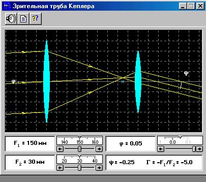 Ознакомьтесь с теорией в конспекте и в учебниках: 1. Трофимова Т.И. Курс физики. § 166. 2. Детлаф А.А., Яворский Б.М. Курс физики § 32.7. Запустите программу «Оптика», «Зрительная труба Кеплера» и «Микроскоп». Нажмите вверху внутренних окон указанных разделов кнопки с изображением страницы. Прочитайте краткие теоретические сведения об этих оптических системах и запишите их в свой конспект.