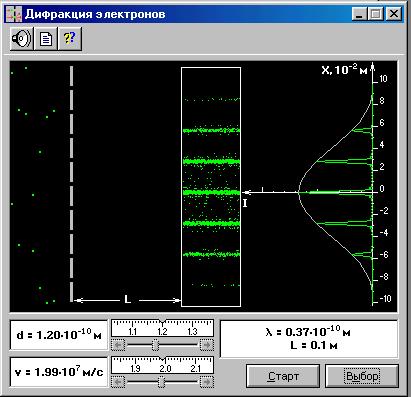 Ознакомьтесь с теорией в конспекте и учебниках: 1. Трофимова Т.И. Курс физики. Гл. 28, §213. 2. Детлаф А.А., Яворский Б.М. Курс физики. Гл. 37, §37.1.Запустите программу «Квантовая физика». Выберите: «Дифракция электронов». Нажмите вверху внутреннего окна кнопку с изображением страницы. Прочитайте краткие теоретические сведения. Необходимое запишите в свой конспект. ЦЕЛЬ РАБОТЫ: · Изучение волновых свойств электронов · Знакомство с компьютерной моделью дифракции электронов при их рассеянии на одномерной монокристаллической решётке (электронография). · Определение периода кристаллической решётки «плёнки металла».