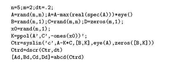 Матрица K должна быть выбрана так, чтобы у собственных значений − KC были отрицательные вещественные части. Текст программы Scilab для выполнения этой процедуры с неопределенными заранее матрицами, помещенными в контекст модели, является следующим: