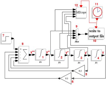 Постоянное слагаемое 0.1 формируется блоком 7 как шаг в момент t=0. Производные y'", y", y' и y отoбражаются в MScope 12. Результаты решения через мультиплексор 9 записаны в файл в ASCII-коде блоком 10. Начальные условия у всех интеграторов нулевые, в соответствии с условиями задачи. У интеграторов есть верхние и нижние пределы. Необходимо не забывать задать их перед пуском. Блок 7 по умолчанию имеет начальное время ступени равное 1. Его необходимо заменить на 0. Блоки 5 и 6 не обязательны, так как можно установить входной множитель в блоке 8. Здесь они включены для наглядности. Часы активации имеют начальное время равное нулю, а период 0.1. Это не имеет никакого отношения к точности решения, а только задает шаг выхода. MScope имеет размерность входных портов портов {1 1 1 1}. Величины Ymin и Ymax были установлены после первого прогона. Период обновления (refresh-period) такой же как окончательное время интегрирования. Запись в файл (блок 10) удобна тем, что данные могут быть импортированы в другие программы. Необходимо задать имя файла и задать строку формата в стиле Fortran. Это значит: формат пишется в круглых скобках и включает: / – новая линия; iw – область целого числа с шириной w знаков; fw.d – область числа с плавающей запятой шириной w знаков, включая d цифры после десятичной запятой. Здесь w> = d+3, чтобы включить по крайней мере одну цифру целого числа, знак и точку; ew.d – область числа с плавающей запятой, степень десяти шириной w знаков, включая d цифры после десятичной запятой. Здесь w> = d+7, чтобы включить по крайней мере одну цифру целого числа, знак для мантиссы, трех знаков для экспоненты, знака экспоненты и одного для точки; nx n – пробелы; tn – перемещает курсор принтера в положение n. В этом примере выбрано (7 (e16.8,1x)) для строки формата (8 десятичных чисел), так как величины переменных малы.