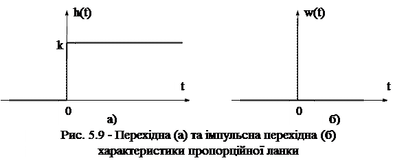 Часові функції та відповідні характеристики (рис. 5.9) мають вигляд: h(t) = k×1(t); w(t) = h'(t) = k×d(t) = d(t).