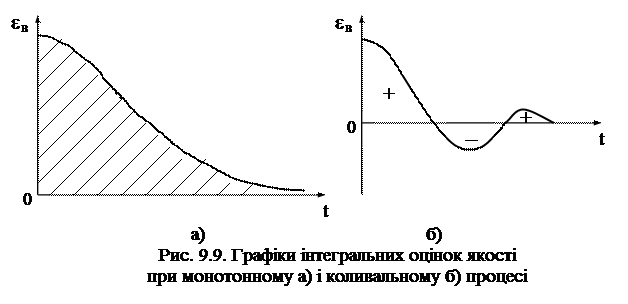 Чим вище швидкодія системи, тим менша величина J00, тому параметри системи слід обирати так, щоб цей інтеграл набував мінімального значення, тобто d J00/dA = 0, де А – параметр системи, який змінюється. Недоліком цієї оцінки є те, що вона придатна тільки до монотонних чи аперіодичних процесів. При коливальному процесі (рис. 9.9 б) площі, що обмежені осями координат і кривою eв(t), додаються алгебраїчно, і мінімуму J00 може відповідати процес з більшою кількістю коливань, тобто з малою швидкодією й навіть з незатухаючими коливаннями. У зв’язку з цим для коливальних процесів застосовують інтегральні оцінки, в яких знакозмінність підінтегральної функції тим чи іншим способом усунена. Однією з таких оцінок є інтеграл модулю сигналу помилки, тобто інтегральна абсолютна оцінка