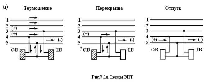 Пятипроводные схемы ЭПТ используются на электропоездах и дизель-поездах серии ДР1 (Рис. 7.1 а). В этой схеме контроль исправности цепей управления осуществляется периодически (только в процессе торможения с помощью специального контрольного провода). При торможении (Рис. 7.1. а) подается напряжение (+) в рабочие провода отпускной 4 и тормозной 3 и (-) в обратный провод 5, что приводит к одновременному срабатыванию катушек отпускного (ОБ) и тормозного (ТВ) вентилей электровоздухораспределителя. Перекрыша осуществляется снятием напряжения с тормозного вентиля при возбужденном вентиле ОБ, а отпуск обеспечивается снятием напряжения с обоих вентилей. Контроль целостности обратного провода 5 обеспечивается при всех процессах работы схемы (торможении, перекрыше, отпуске), контроль целостности остальных проводов происходит только при торможении. Провод 1 является контрольным. В положениях торможения и перекрыши наличие давления воздуха в ТЦ контролируется с помощью сигнального провода 2. Таким образом, при торможении используются все пять линейных проводов, при перекрыше ток протекает по проводам отпускному 4 и обратному 5, а при отпуске - только по обратному проводу 5 (Подробно работа схемы будет описана ниже).