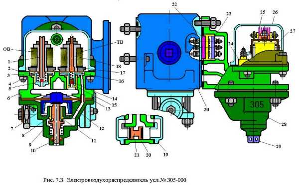 Блок питания БП (статический преобразователь) является источником постоянного и переменного тока для питания и контроля цепей ЭПТ. Статические преобразователи рассчитаны на входное напряжение питания 50 пли 110 В и должны обеспечивать на выходе: для цепей управления ЭПТ - напряжение постоянного тока 50 В при величине тока 7 - 8 А; для цепей контроля - напряжение переменного тока 50 В при величине тока 0,5 – 0,6 А и частоте 625 Гц. Блок управления БУ представляет собой прибор, в котором сосредоточена вся релейно-контактная часть ЭПТ. БУ включает в себя четыре реле: сильноточное «К» с силовым контактом К1, контрольное «КР» с контактами КР1 и КР2, тормозное «ТР» и отпускное «ОР» с соответствующими контактными группами ТР1 - ТР5 и ОР1 - ОР5.(см. рис. 7.8.). Все реле за исключением сильноточного имеют выдержку времени на отключение. Клок управления содержит также выпрямительный мост «ВК», конденсатор замедления «Сз», включенный параллельно катушке реле «КР», шунтирующий конденсатор «Сш», резисторы ограничения тока и предохранители. Световой сигнализатор имеет три лампы: «О» - отпуск («линия»), которая горит при всех положениях ручки крана машиниста и свидетельствует о целостности линейных проводов; «П» - перекрыша, горит при III и IV положениях ручки крана машиниста; «Т» - торможение, горит при VА, V и VI положениях ручки крана машиниста. Контроллер крана машиниста - используется для непосредственного управления ЭПТ. Междувагонные соединения - состоят из рукавов с универсальными соединительными головками усл.№ 369 А. Клеммные коробки - используются для крепления и соединения линейных проводов. Изолированные подвески - служат для подвешивания соединительных рукавов на локомотиве и на хвостовом вагоне. Электровоздухораспределитель (ЭВР) усл.№ 305-000 (рис. 7.3) состоит из четырех основных частей: электрической части 6, пневматического реле 28, рабочей каперы 30 и переключательного клапана 21. Электрическая часть состоит из корпуса 6, в котором на фланцах 2 и 17 установлены отпускной (ОБ) и тормозной (ТВ) вентили, закрытые кожухом 26 через резиновую прокладку. Катушки вентилей укреплены на сердечниках 18. Уплотнением фланцев 2 и 17 служат металлические диафрагмы 4 с паронитовыми прокладками. Величина тока отпадания якорей 3 и 16 регулируется винтами 1, вращением которых изменяется величина воздушного зазора между сердечником и якорем. Регулировочный винт ОВ имеет сквозной осевой канал диаметром 1,3 мм. Якоря ОВ и ТВ имеют направляющие хвостовики во втулках 5, запрессованных в корпус 6. В якоре 3 отпускного вентиля помещен отпускной клапан, а в якоре 16 тормозного вентиля - тормозной клапан 14. В седле 15 тормозного клапана имеется калиброванное отверстие диаметром 1,8 мм. При невозбужденных катушках электромагнитов якоря 3 и 16 удерживаются в нижнем положении пружинами, расположенными между якорями и металлическими диафрагмами 4. На ярме 27 закреплен диод 25. Провода от катушек и диода выведены на зажимы колодки 24, которая соединена с контактной колодкой 23, укрепленной на фланце корпуса электрической части. Колодка 22 крепится к фланцу рабочей камеры. Обе колодки имеют по три зажима и по три электрических контакта. В схеме двухпроводного ЭПТ используется только по одному зажиму и одному контакту.