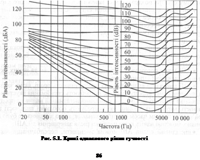 Критерії, які використовують для оцінювання несприятливого впливу АШ, відрізняються один від одного врахуванням цих факторів і математичною структурою. Найпростішими критеріями є гучність і рівень гучності шуму, які враховують спектральний склад та інтенсивність шуму для визначення ступеня його сприйняття. Сприйняття гучності звуку людиною з нормальним слухом визначається за допомогою кривих однакового рівня гучності (рис. 5.1).