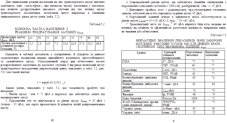 Шум, який може бути визначений як небажаний, є побічним явищем під час експлуатації транспортних засобів, якого поки що неможливо уникнути. І повітряний транспорт не єдиний, що породжує шум. В аеропорту шум утворюється головним чином повітряними суднами: під час руху в повітрі й на землі (по злітній смузі, рулі-жних доріжках та перону), роботи авіадвигунів на місцях стоянки й прогрівання двигунів, на місцях опробування (тестування) двигунів після ремонту й технічного обслуговування. Крім цього, джерелами шуму в районі аеропорту є спецавтотранспортні засоби, найважливіші з яких— теплові й вітрові машини, обладнані реактивними двигунами. Однак шум від цих засобів, за виконання вимог щодо правильної орієнтації житлової забудови стосовно служб аеропорту, може впливати на акустичну обстановку тільки в межах території аеродрому. Шумове забруднення зони аеропорту зумовлює актуальність проблеми захисту здоров'я людей. Шум може порушувати показники праці, відпочинку, сну, мовного зв'язку людей, сприймання акустичних сигналів (табл. 5.1), спричиняти