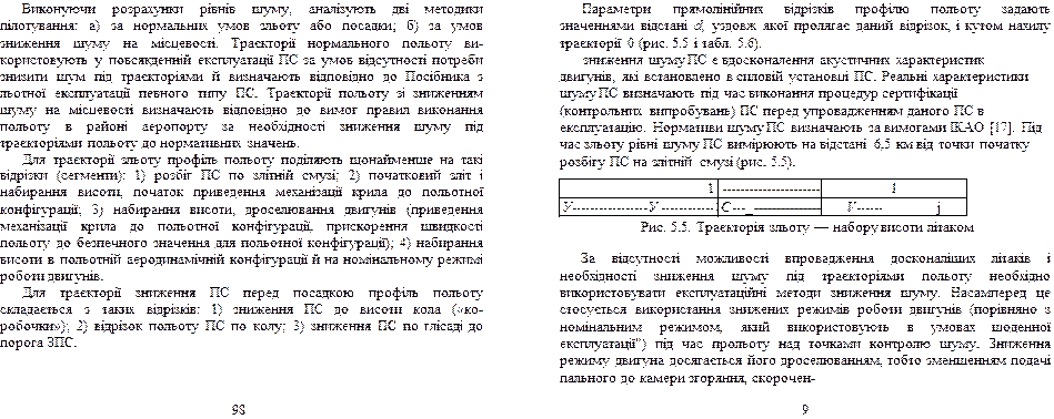 Рис. 5.5. Траєкторія зльоту — набору висоти літаком За відсутності можливості впровадження досконаліших літаків і необхідності зниження шуму під траєкторіями польоту необхідно використовувати експлуатаційні методи зниження шуму. Насамперед це стосується використання знижених режимів роботи двигунів (порівняно з номінальним режимом, який використовують в умовах щоденної експлуатації") під час прольоту над точками контролю шуму. Зниження режиму двигуна досягається його дроселюванням, тобто зменшенням подачі пального до камери згоряння, скорочен-
