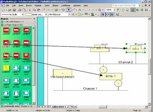 На приведенной диаграмме отображены четыре устройства – маршрутизатор RTR-1, два цифровых контроллера DIO-1 и DIO-2, а так же датчик MDS-LON. Эти устройства соединены двумя физическими каналами Channel1 и Channel2. Эти каналы физически разделены между собой маршрутизатором. Один канал, Channel2, это канал TP/FT, другой канал, Channel1, это канал IP. К каналу IP присоединен компьютер LNS. Здесь же, на этой диаграмме, отображены имеющиеся на устройствах функциональные блоки и связи между ними. Функциональные блоки – голубые прямоугольники со скругленными краями. У каждого функционального блока обозначен набор входных и выходных сетевых переменных. Линиями обозначены связи между сетевыми переменными, образующие собственно программу сети. Чтобы на примере проиллюстрировать процесс инсталляции сети, приведем одну из лабораторных работ курса «Введение в технологию LonWorks», на которой шаг за шагом создается приведенная выше сетевая диаграмма. Первым шагом запустите программу LonMaker. Эта программа построена на основе программы MS Visio, поэтому имеет знакомый интерфейс. Слева в LonMaker имеется окно папок мастер-фигур. Мастер-фигуры соответствуют тому типу оборудования, которое будет ставиться в проект. Мастер-фигуры и файлы внешнего интерфейса обычно поставляет производитель оборудования. Так же их можно скачать сайта производителя или из каталога ассоциации LonMark. На верхней панели инструментов имеется новый пункт – специальное меню LonMaker. Это меню позволяет управлять всеми свойствами сети. Так же при создании проекта автоматически создается блок, отображающий в сети место сетевого инструментария, или ту точку, к которой присоединен данный компьютер с проектом.