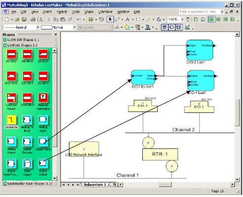 Теперь при помощи программы LonMaker можно начинать программирование сети. Первым шагом создается канал LON TP/FT-10. В окне папок мастер-фигур откройте вкладку Basic Shapes (или NodeBuilder Basic Shapes, в зависимости от конфигурации программного обеспечения). Выберите фигуру канала Channel и перетащите в окно проекта на чистый лист.