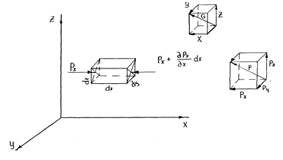 Рівняння гідростатичного тиску рідини (рівняння Ейлера). Поверхні рівного тиску. Вільна поверхня рідини. Основне рівняння гідростатики. Закон Паскаля. Абсолютний і манометричний тиск. Вакуум. П’єзометрична висота. Гідравлічні машини гідростатичного дійства. Для виводу рівнянь рівноваги рідини виделемо у рідині, що знаходиться у спокоґ, нескінченно малий прямокутний паралелепіпед з розмірами по вісях dx, dy, dz та прикладемо до нього масові сили з проекціями ґх рівнодіючиий G – X, Y,Z, та сили гідростатичного тиску – внутрішні з рівнодиючою Р0 і проекціями Px, Py, Pz.