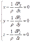 Складаємо три рявняння рівноваги проекцій сил за 3-м Законом Ньютона. Після переутворень отримаємо рівняння рівноваги рідини у загальному вигляді: