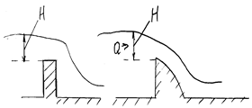 Тут b – ширина водозлива; m – коефіціент витрати, який визначається по емпірічним формулам, залежно від типу і схеми роботи в потоці. Розрахункові залежності наведені в [3, 4]. Цікавим розділом гідравліки нерівномірного руху рідини є розрахунок області руху води за водозливом, де при певних умовах спостерігається вплив гідравлічного стрибка.