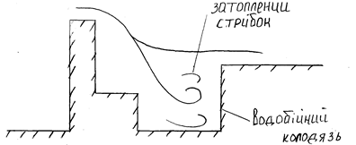 Гідравлічний стрибок – різьке збільшення глибини потоку за водозливом З утворенням зони циркуляційно-зворотнього руху – бурхуну. В цієї зоні досліджується інтенсивне руйнування русла, тому розроблені методи розрахунку умов для затоплення гідравлічного стрибка та приведення руху за водозливом у спокійний стан (водобійний колодязь, водобійна стінка) [3,4].