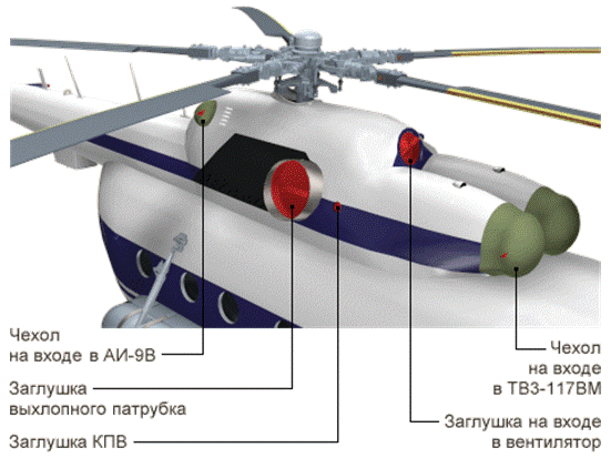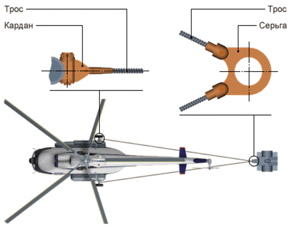 По мягкому грунту вертолет буксируется за основные опоры шасси при помощи тросов. Скорость буксировки – не более 3 км/ч. Угол поворота вертолета при буксировке - не более 30°.