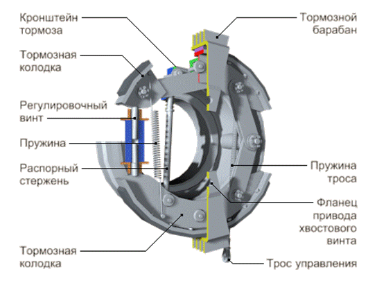 Тормоз крепится к главному редуктору на шести шпильках. На корпусе закреплены две колодки, стянутые пружиной. Между колодками установлена распорная втулка. На одной из колодок закреплен рычаг, соединенный с тросовой управления. Для регулировки зазора 0,2...0,3 мм предусмотрены два регулировочных винта. Барабан закреплен на хвостовом валу и вращается вместе с ним. Тормоз управляется ручкой, установленной в кабине пилотов справа от левого пилота. Карданный вал шлицевой вилкой соединяется со шлицевым наконечником вала вентилятора, другой конец вала соединен четырьмя болтами с фланцем вывода главного редуктора. Карданный вал - труба, изготовленная из легированной стали, с двумя шарнирами на концах. Соединения карданов выполнены на игольчатых подшипниках (4 шт.). Смазываются подшипники маслом для гипоидных передач через масленки, ввернутые в крестовины карданов.