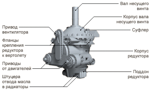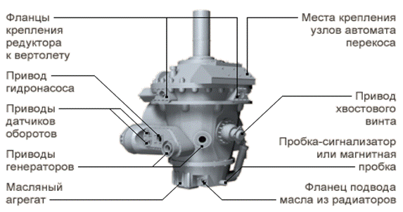 На левой и правой сторонах редуктора крепятся вспомогательные агрегаты вертолета (два генератора переменного тока, два гидронасоса НШ-39М, компрессор АК-50Т, два датчика Д-1 тахометра), в задней части корпуса редуктора расположены привод вала трансмиссии, фланец крепления тормоза несущего винта, фланец крепления узлов автомата перекоса.